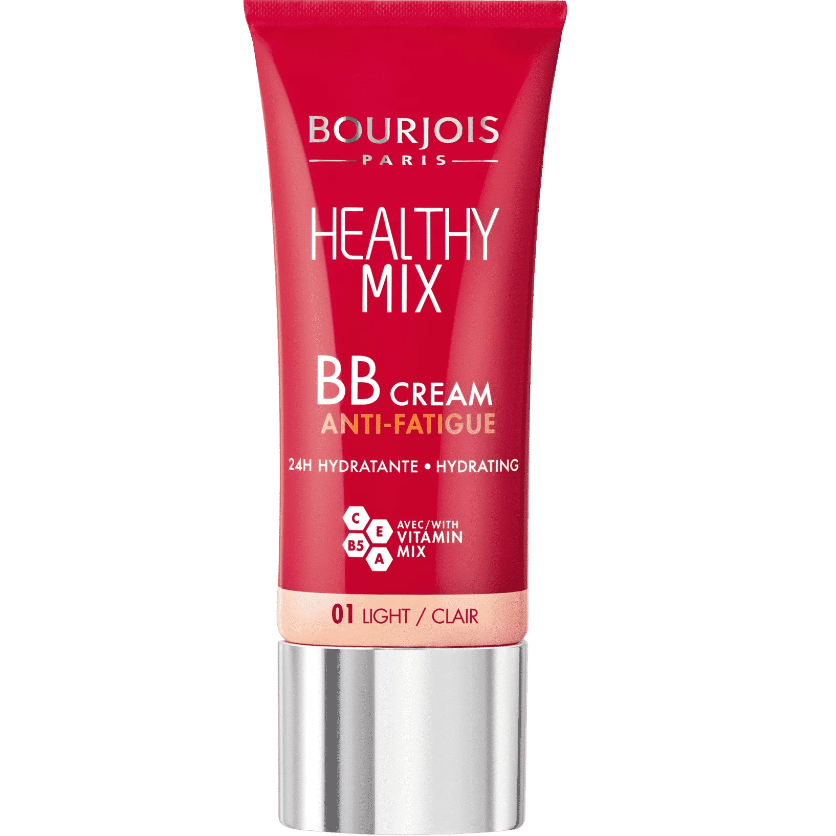 Hydratante comme une crème de soin et couvrante comme un fond de teint, la BB Crème Anti-Fatigue Bourjois Healthy Mix unifie instantanément le teint et camoufle les signes de fatigue. Le complexe de vitamines A, C, E et B5 booste l’éclat pour un teint naturel et frais.