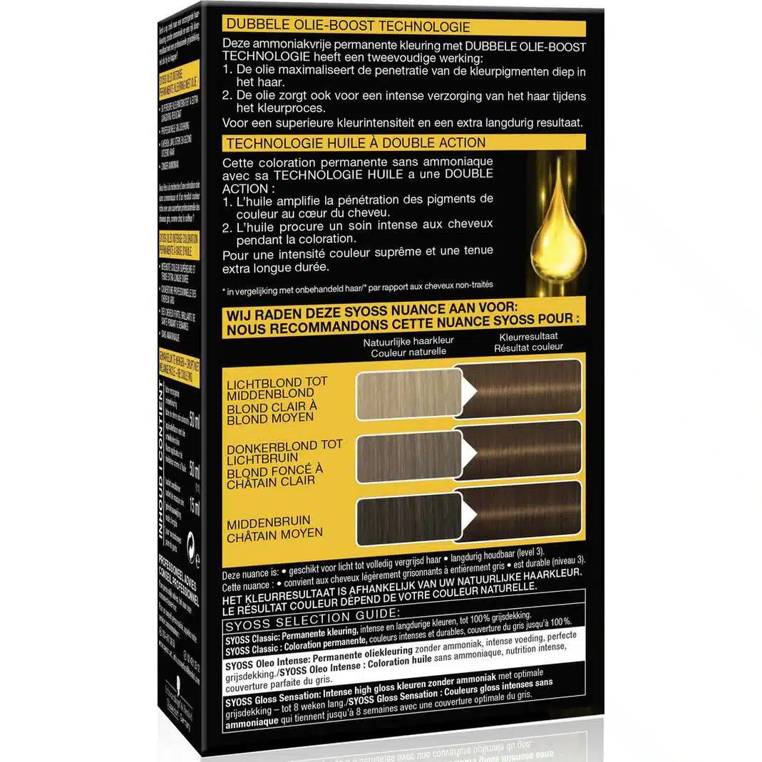 Cod?velopp?e et test?e par des coiffeurs et coloristes, Syoss Oleo Intense est la toute premi?re coloration permanente ? bases d’huiles 100 % pures et sans ammoniaque, pour un confort maximal du cuir chevelu. Sa formule unique se transforme en une cr?me riche qui amplifie la couleur et procure un soin nutritif intense, pour des cheveux 40 % plus doux et ?clatants de sant?. R?sultat ? Une intensit? de couleur supr?me et durable avec une couverture professionnelle des cheveux gris.